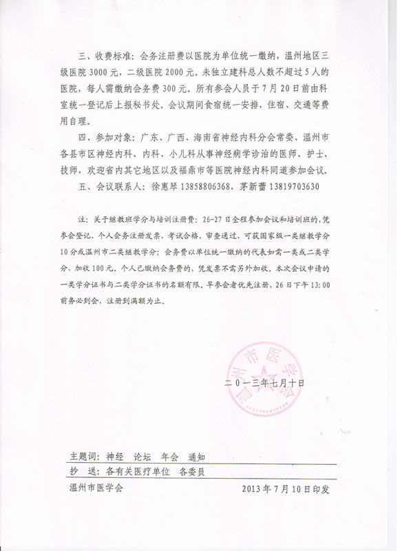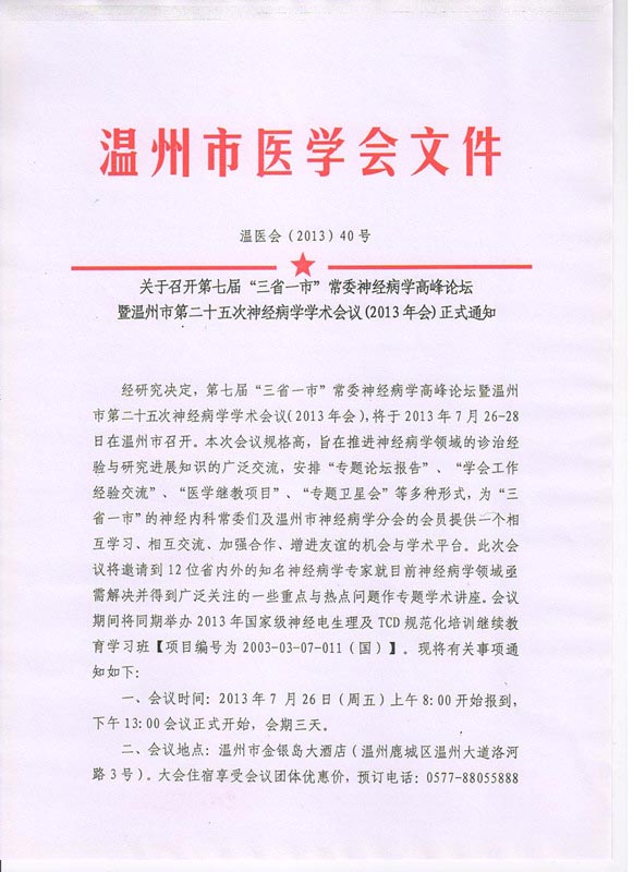 关于召开第七届“三省一市”常委神经病学高峰论坛暨温州市第二十五次神经病学学术会议(2013年会)正式通知