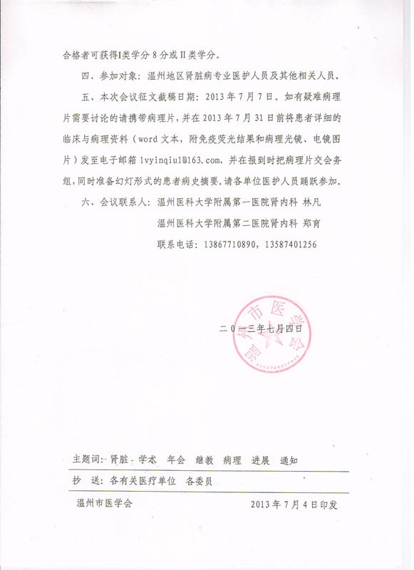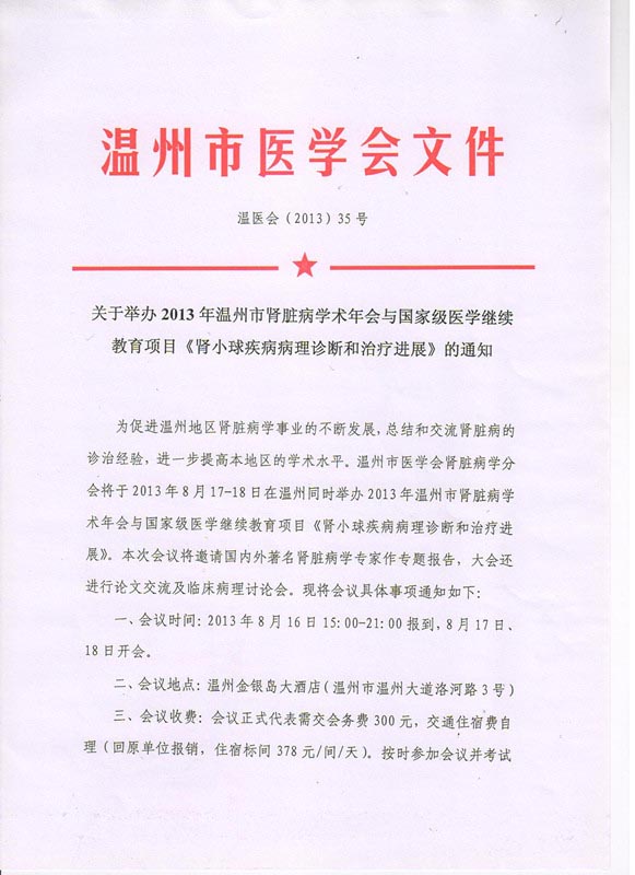 关于举办2013年温州市肾脏病学术年会与国家级医学继续教育项目《肾小球疾病病理诊断和治疗进展》的通知