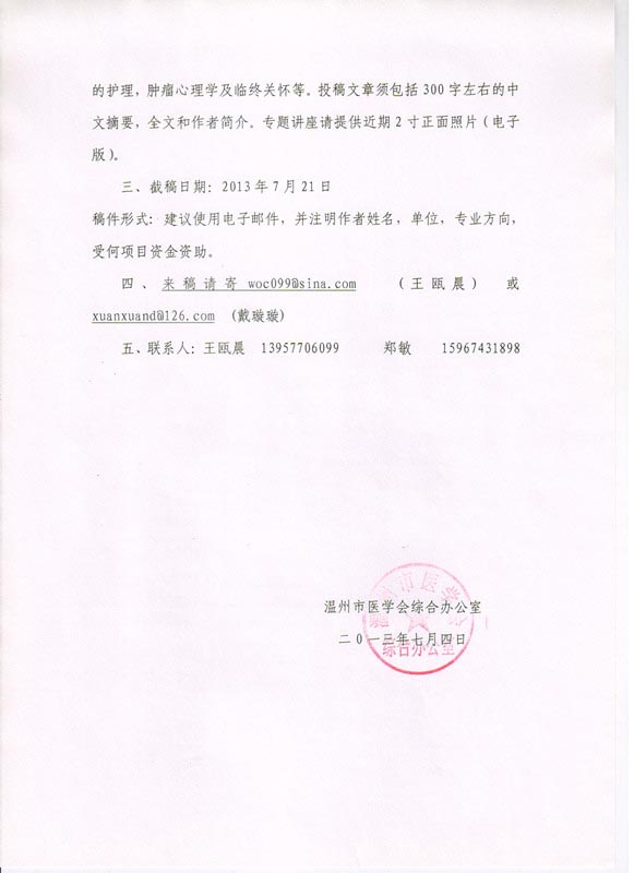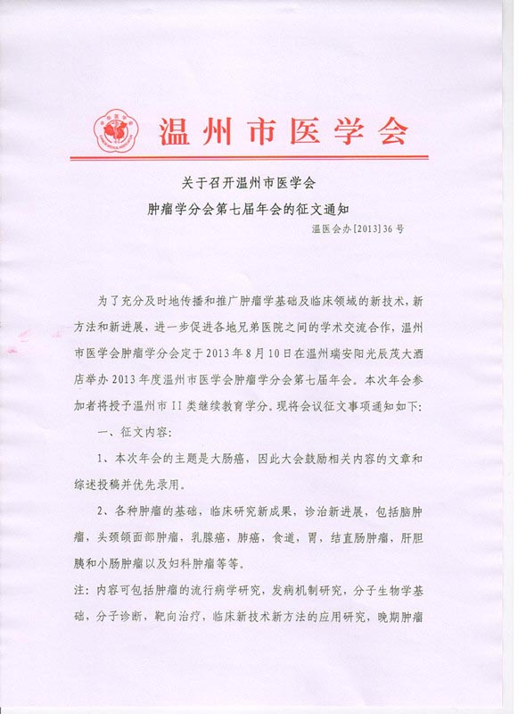 关于召开温州市医学会肿瘤学分会第七届年会的征文通知