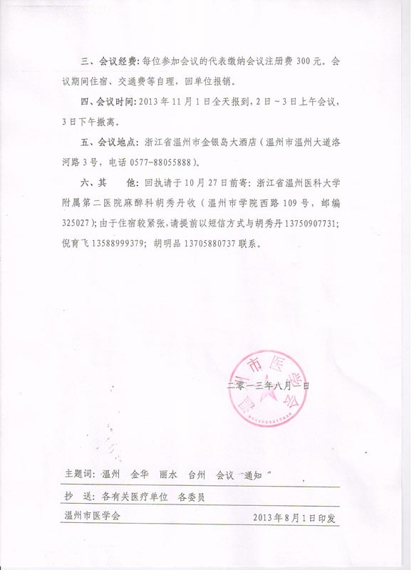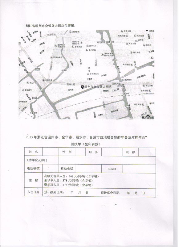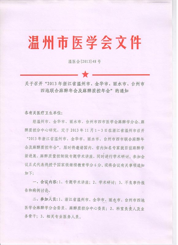 关于召开“2013年浙江省温州市、金华市、丽水市、台州市四地联合麻醉年会及麻醉质控年会”的通知