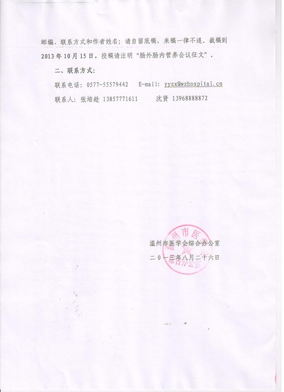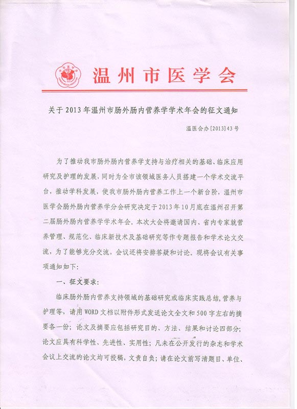 关于2013年温州市肠外肠内营养学学术年会的征文通知
