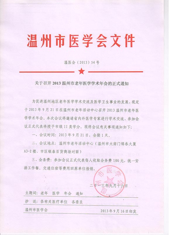 关于召开2013温州市老年医学学术年会的正式通知