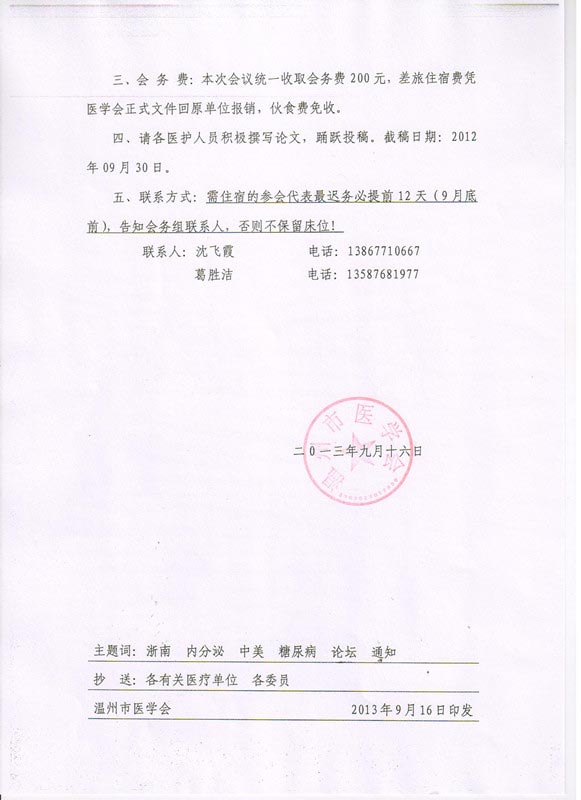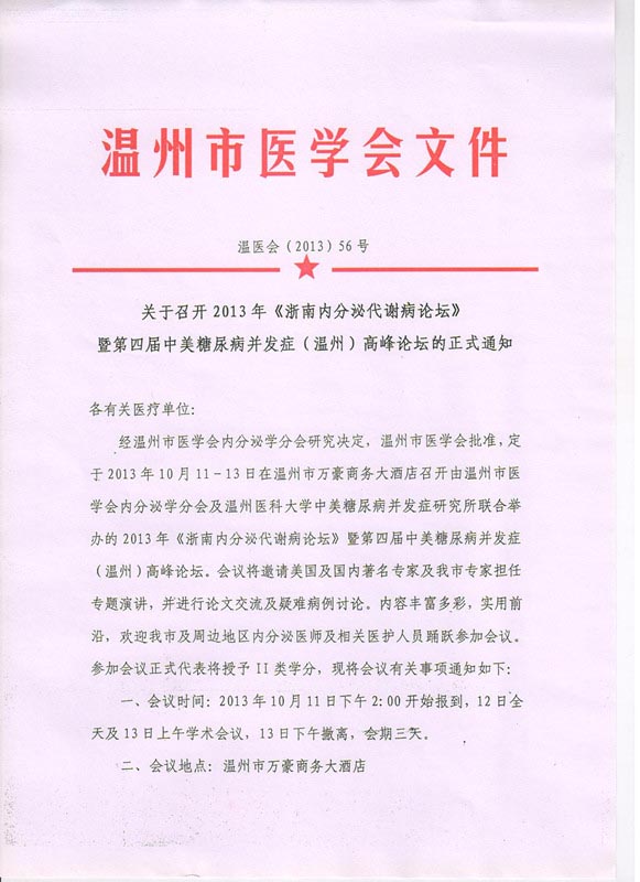 关于召开2013年《浙南内分泌代谢病论坛》暨第四届中美糖尿病并发症(温州)高峰论坛的正式通知