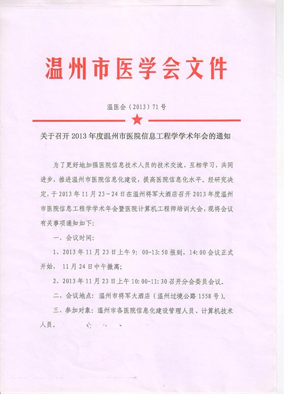 关于召开2013年度温州市医院信息工程学学术年会的通知