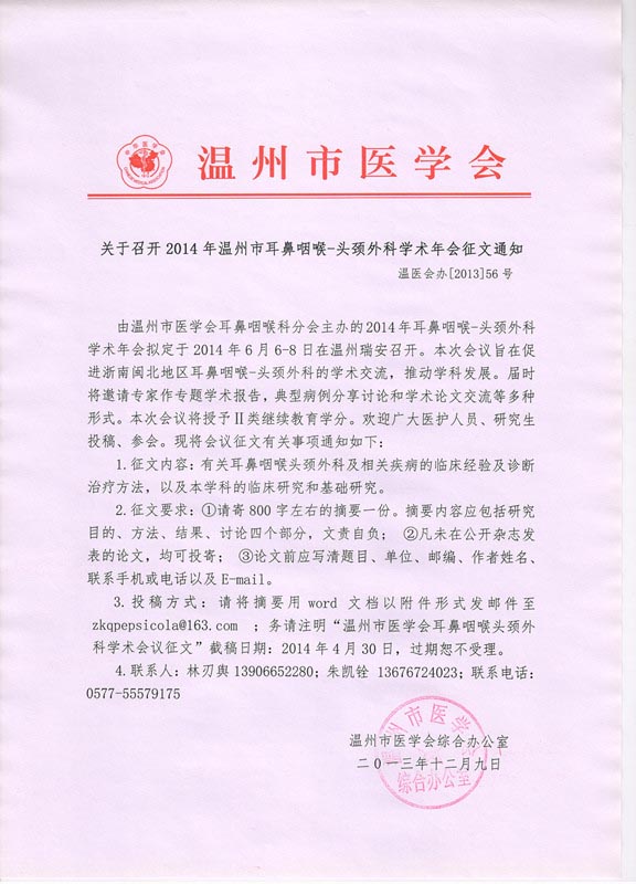 关于召开2014年温州市耳鼻咽喉-头颈外科学术年会征文通知
