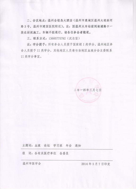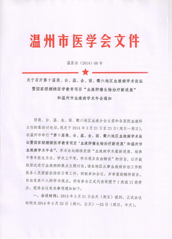 关于召开第十届甬、台、温、金、丽、衢六地区血液病学术论坛暨国家级继续医学教育项目“血液肿瘤生物治疗新进展”和温州市血液病学术年会通知