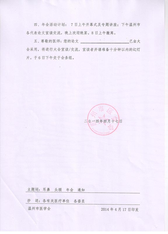 关于召开2014年温州市耳鼻咽喉-头颈外科学术年会的正式通知