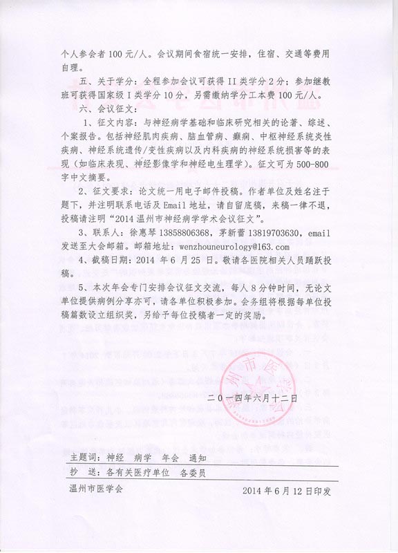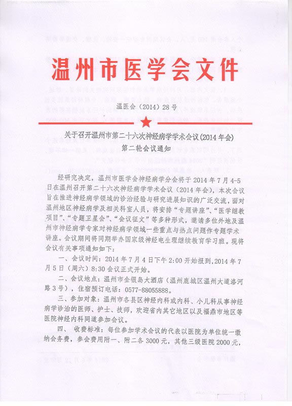 关于召开温州市第二十六次神经病学学术会议(2014年会)第二轮会议通知