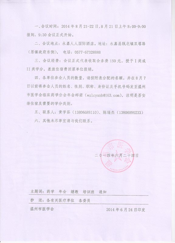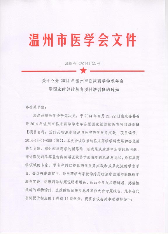 关于召开2014年温州市临床药学学术年会暨国家级继续教育项目培训班的通知