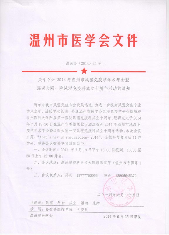 关于召开2014年温州市风湿免疫学学术年会暨温医大附一院风湿免疫科成立十周年活动的通知