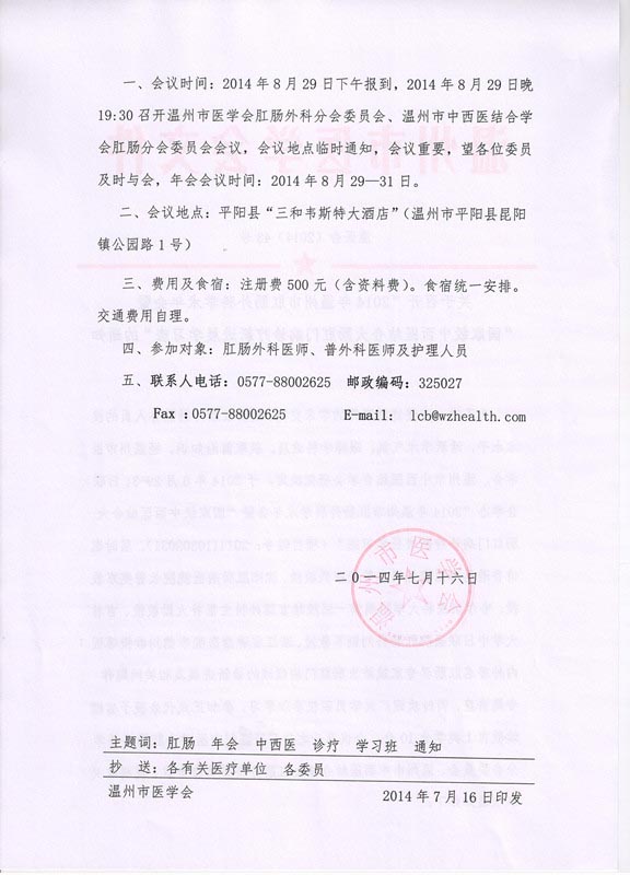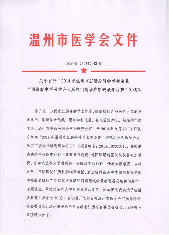 关于召开2014年温州市肛肠外科学术年会暨“国家级中西医结合大肠肛门病诊疗新进展学习班”的通知