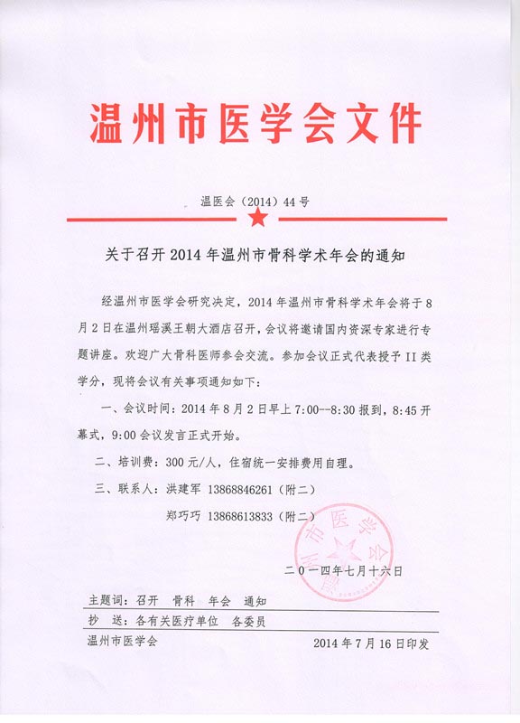 关于召开2014年温州市骨科学术年会的通知