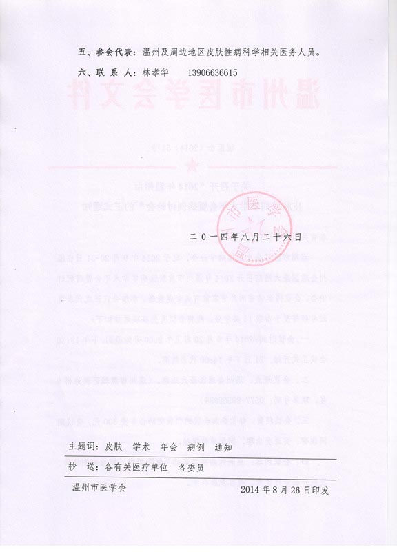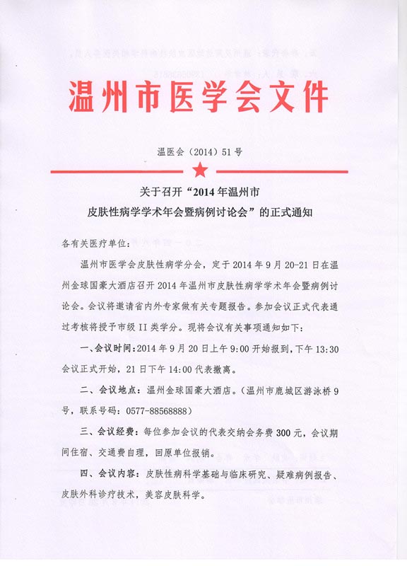 关于召开“2014年温州市皮肤性病学学术年会暨病例讨论会”的正式通知