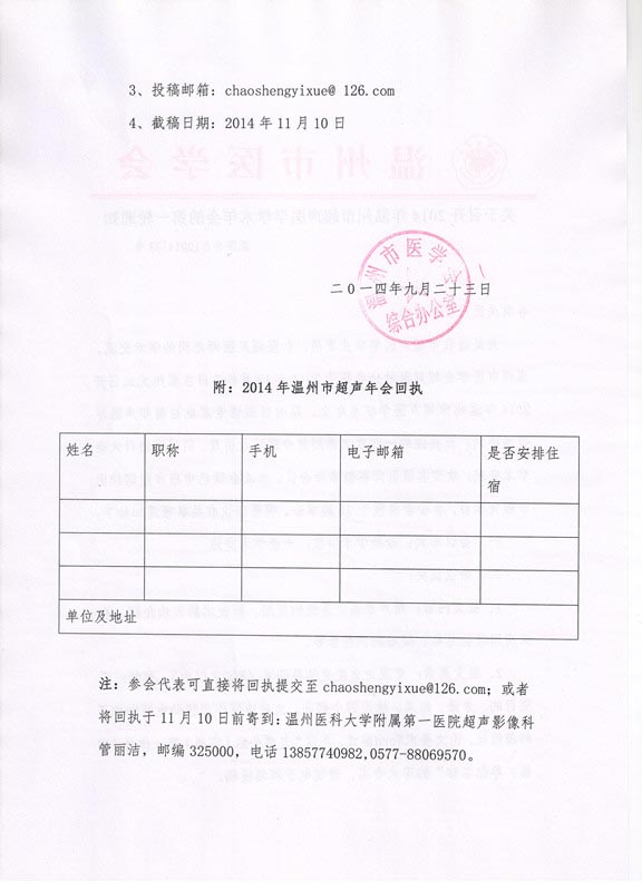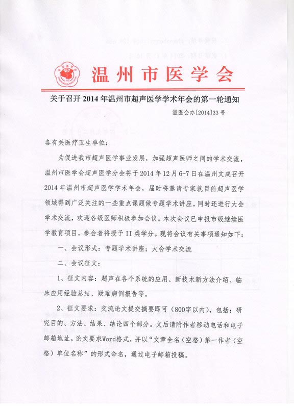 关于召开2014年温州市超声医学学术年会的第一轮通知