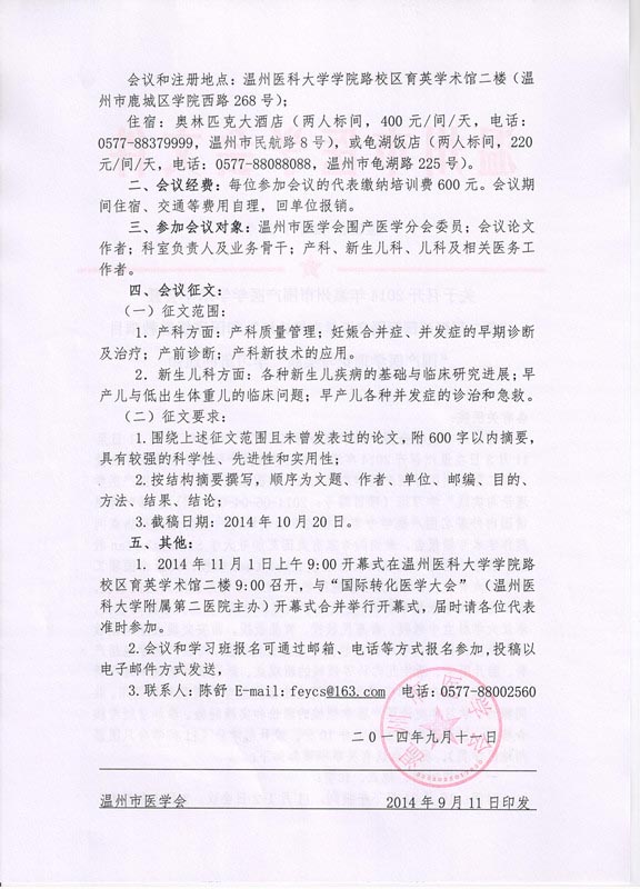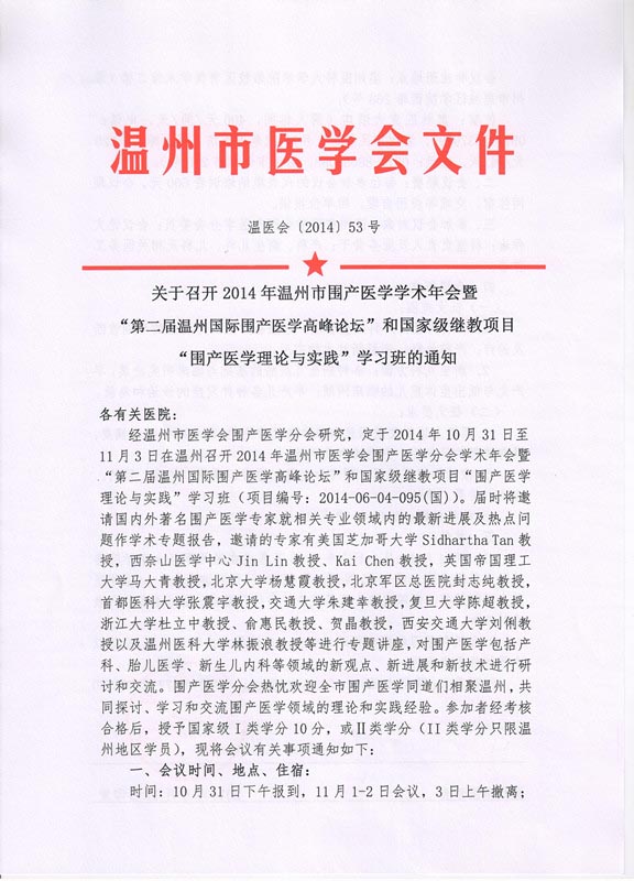 关于召开2014年温州市围产医学学术年会暨“第二届温州国际围产医学高峰论坛”和国家级继教项目“围产医学理论与实践”学习班的通知