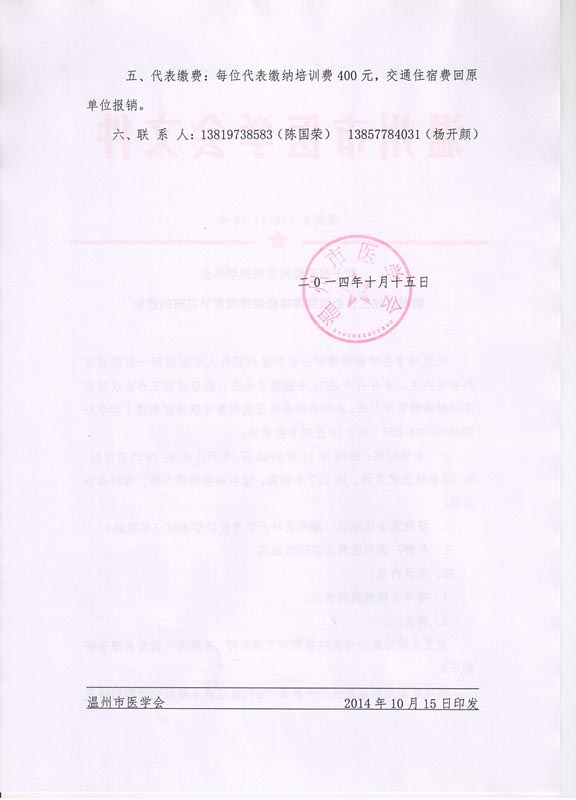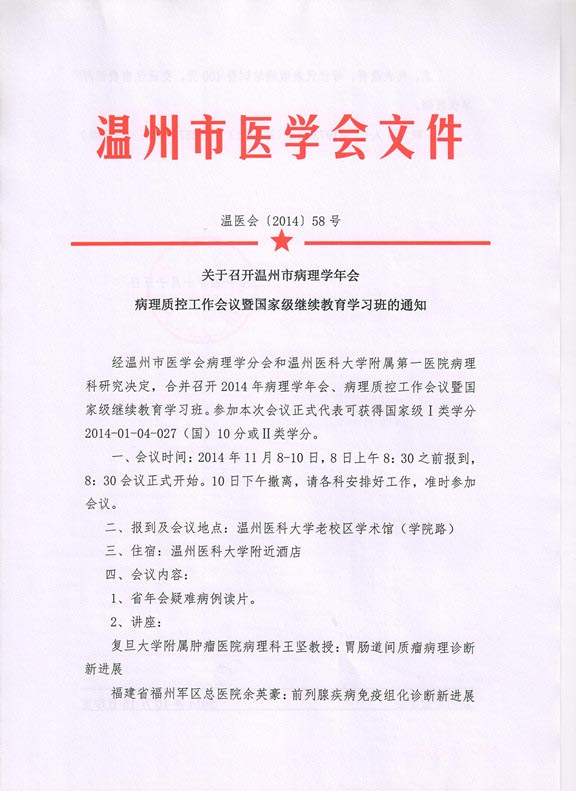 关于召开温州市病理学年会病理质控工作会议暨国家级继续教育学习班通知