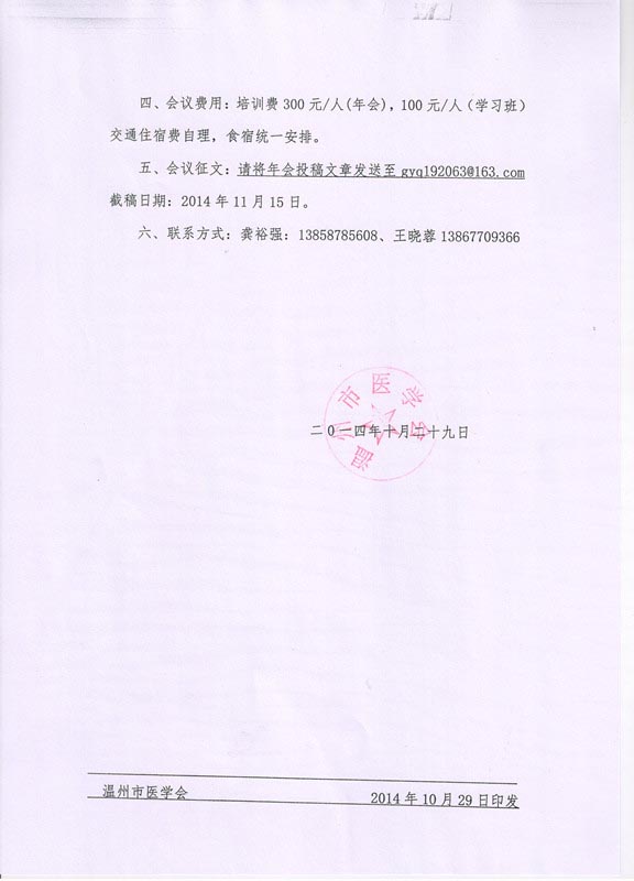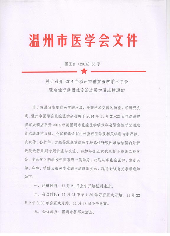 关于召开2014年温州市重症医学学术年会暨急性呼吸困难诊治进展学习班的通知