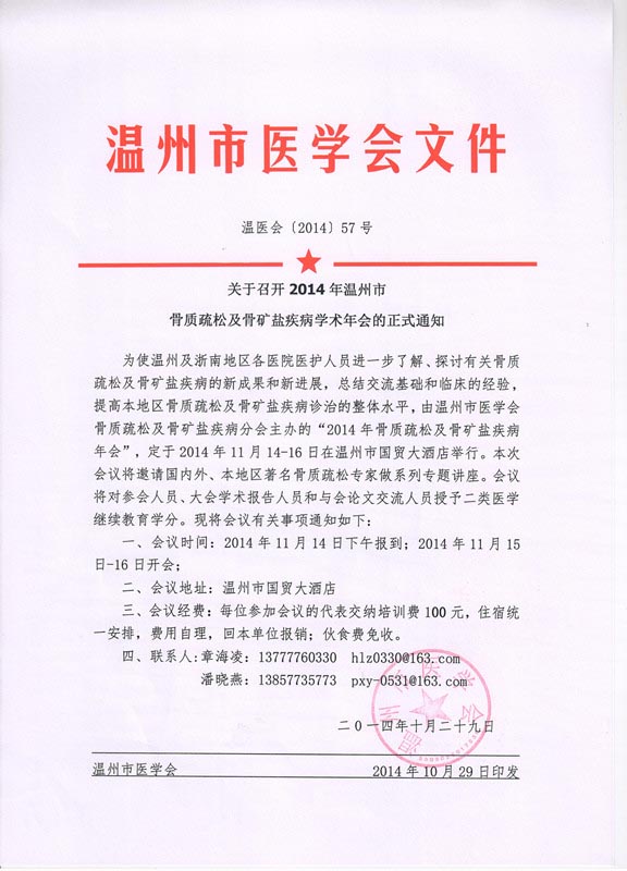 关于召开2014年温州市骨质疏松及骨矿盐疾病学术年会的正式通知