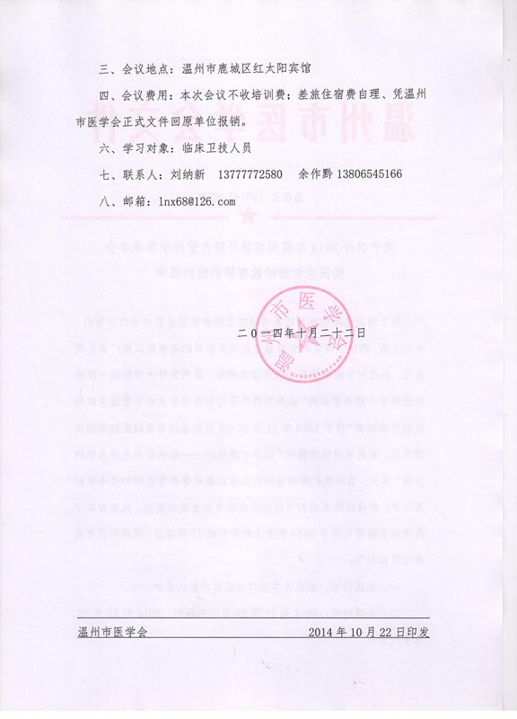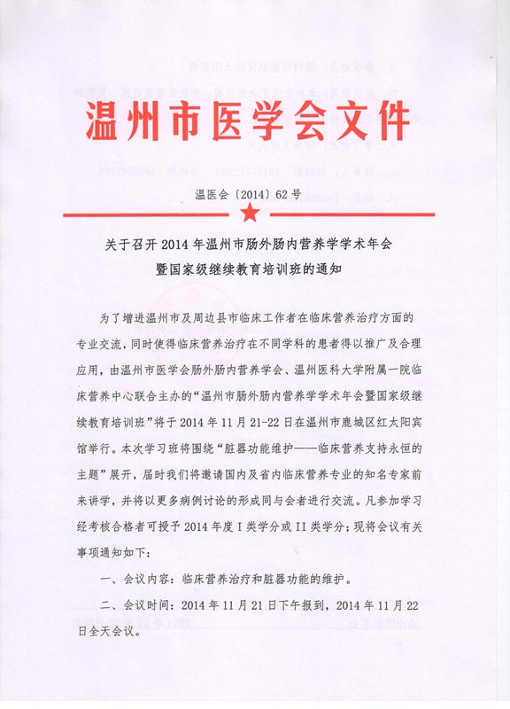 关于召开2014年温州市肠外肠内营养学学术年会暨国家级继续教育培训班的通知