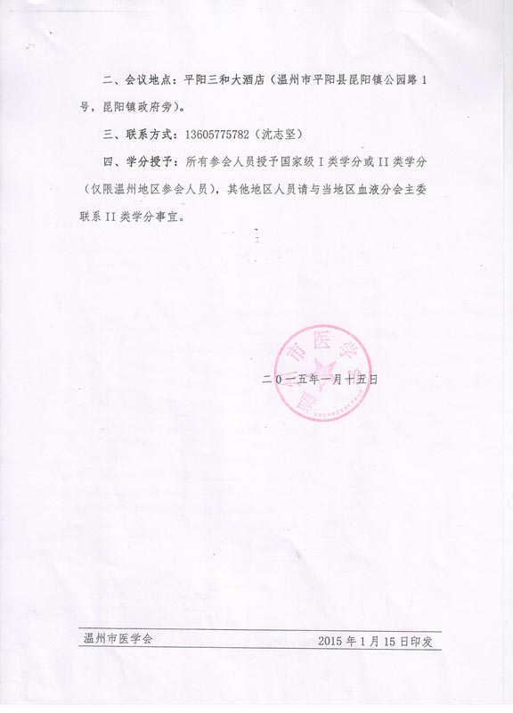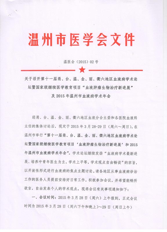 关于召开第十一届甬、台、温、金、丽、衢六地区血液病学术论坛暨国家级继续医学教育项目“血液肿瘤生物治疗新进展”及2015年温州市血液病学术年会