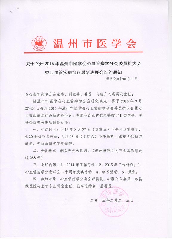 关于召开2015年温州市医学会心血管病学分会委员扩大会暨心血管疾病治疗最新进展会议的通知