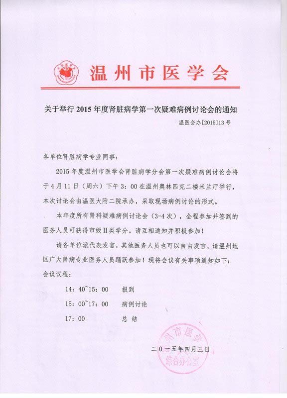 关于举行2015年度肾脏病学第一次疑难病例讨论会的通知