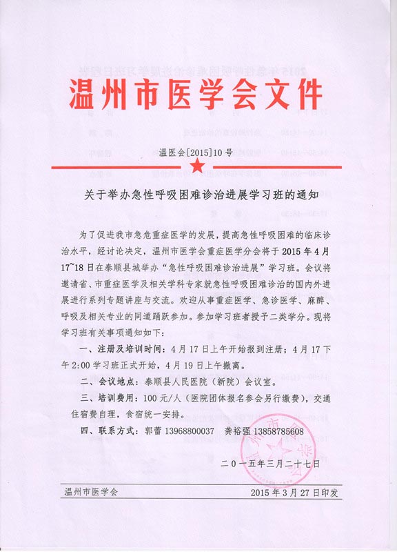 关于举办急性呼吸困难诊治进展学习班的通知