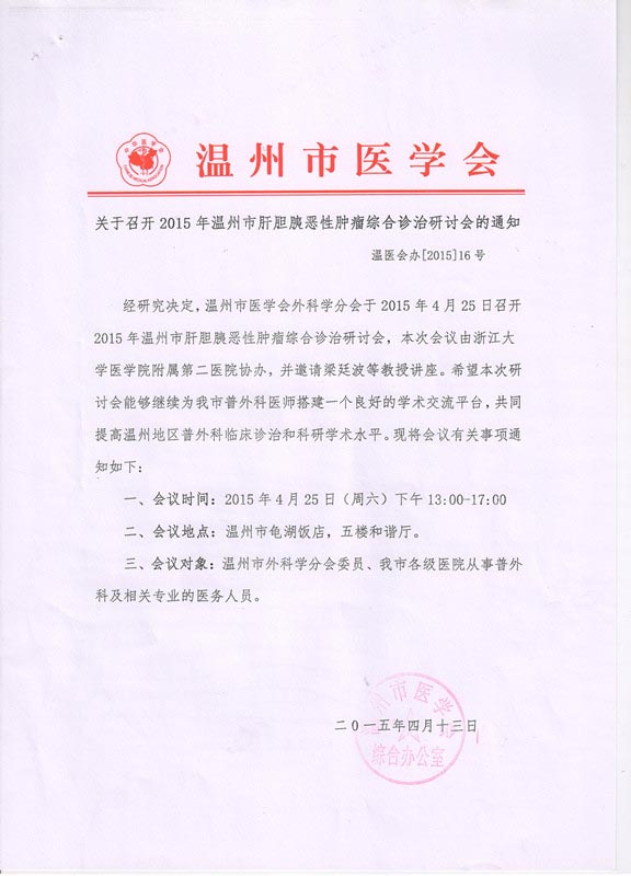 关于召开2015年温州市肝胆胰恶性肿瘤综合诊治研讨会的通知