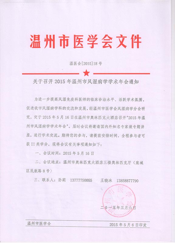 关于召开2015年温州市风湿病学学术年会通知