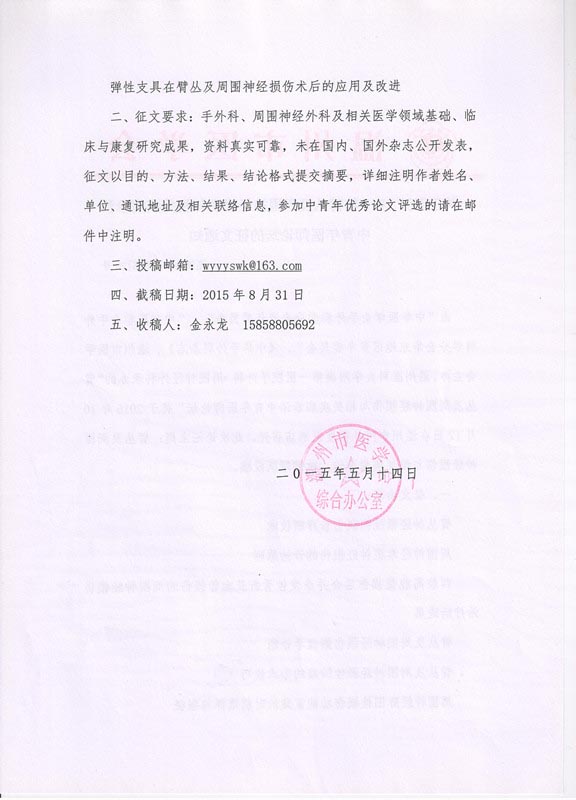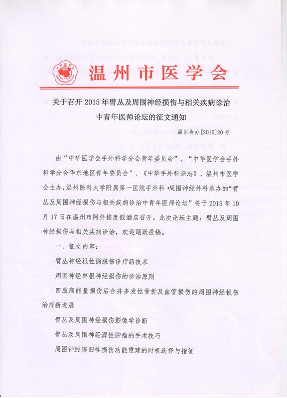 关于召开2015年臂丛及周围神经损伤与相关疾病诊治中青年医师论坛的征文通知
