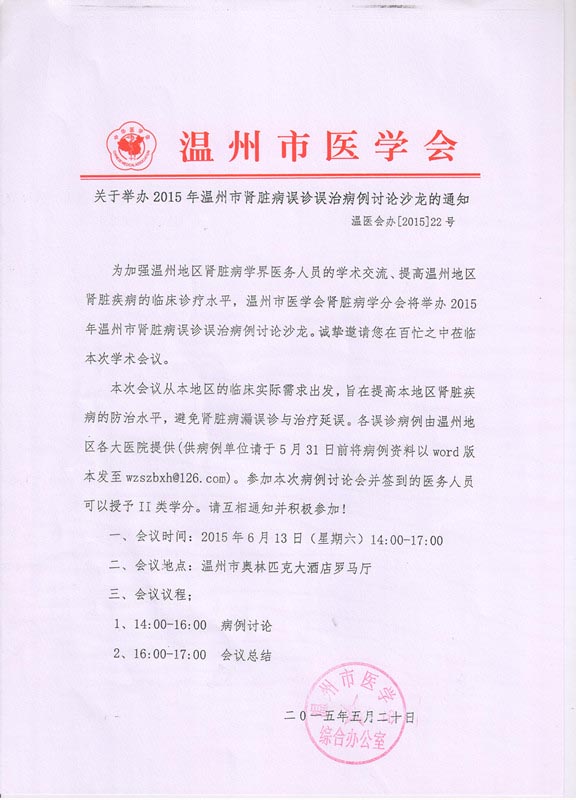 关于举办2015年温州市肾脏病误诊误治病例讨论沙龙的通知