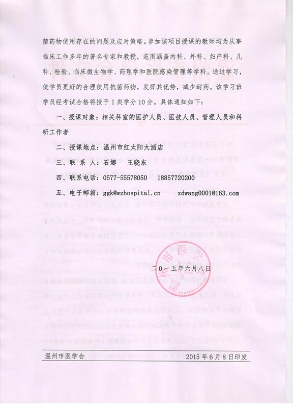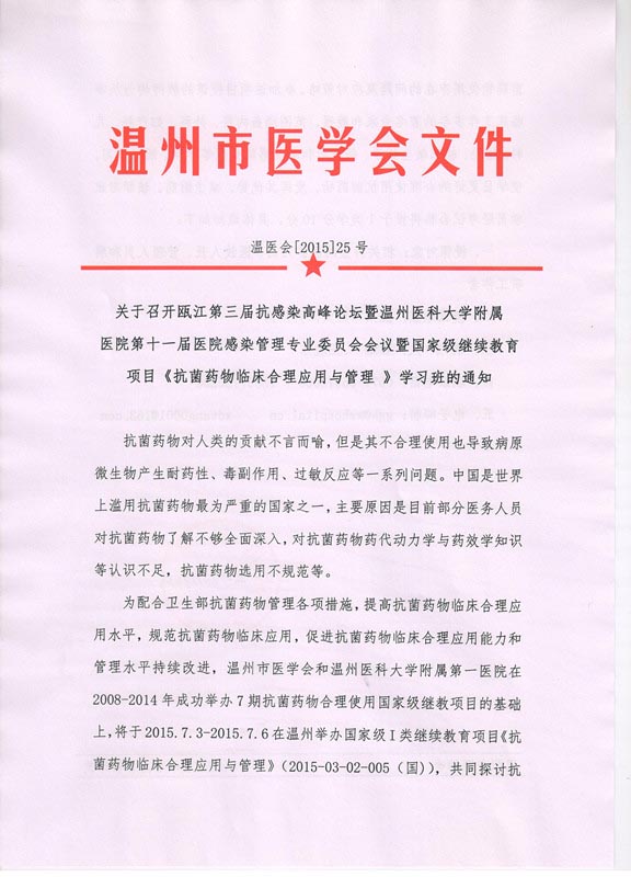 关于召开瓯江第三届抗感染高峰论坛暨温州医科大学附属医院第十一届医院感染管理专业委员会会议暨国家级继续教育项目《抗菌药物临床合理应用与管理》学习班的通知