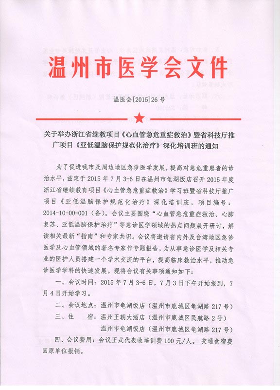关于举办浙江省继教项目《心血管急危重症救治》暨省科技厅推广项目《亚低温脑保护规范化治疗》深化培训班的通知
