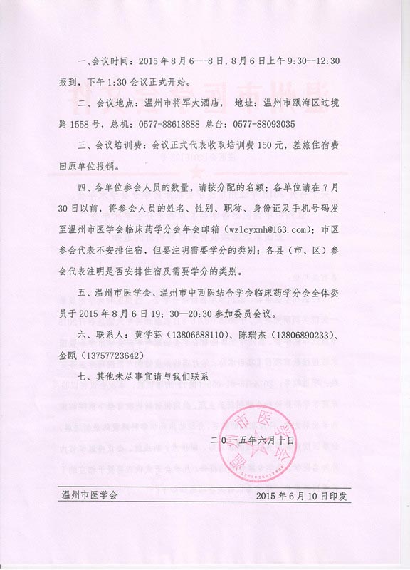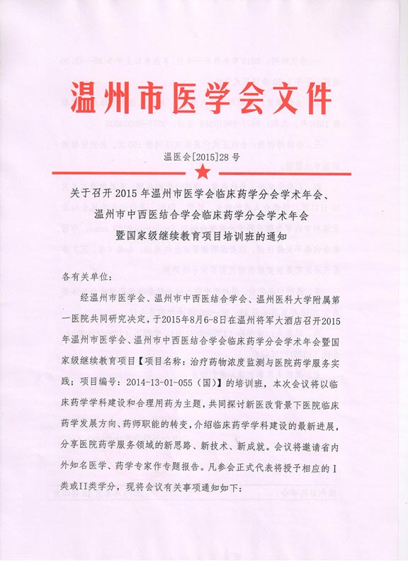 关于召开2015年温州市医学会临床药学分会学术年会、温州市中西医结合学会临床药学分会学术年会暨国家继续教育项目培训班的通知
