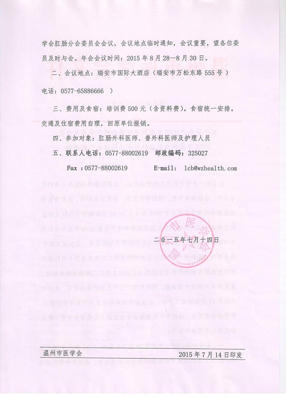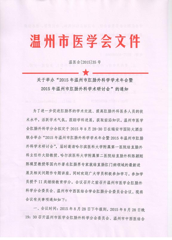 关于举办“2015年温州市肛肠外科学学术年会暨2015年温州市肛肠外科学术研讨会”的通知
