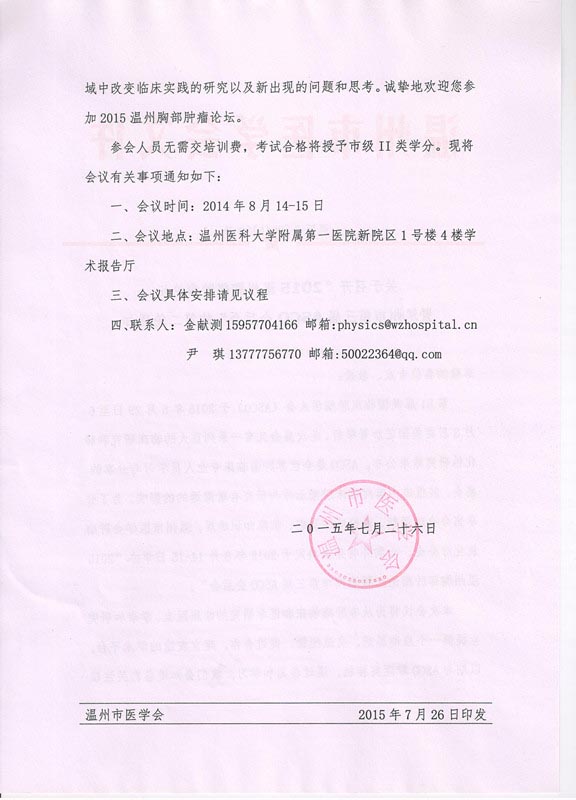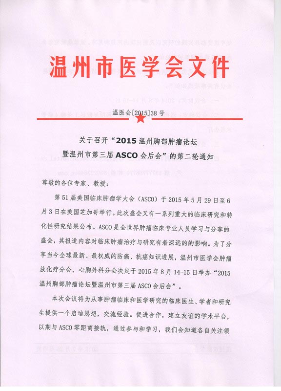 关于召开“2015温州胸部肿瘤论坛暨温州市第三届ASCO会后会”的第二轮通知