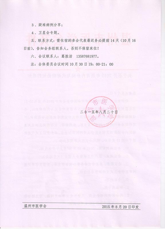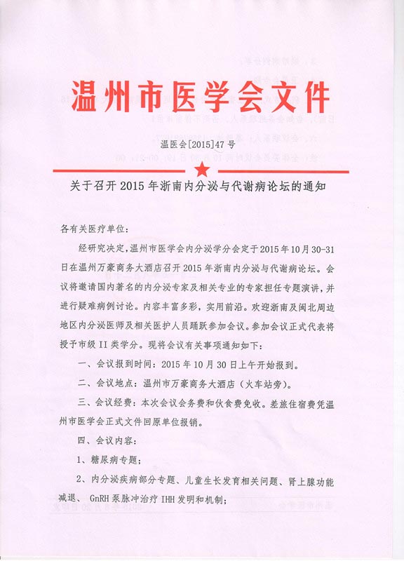 关于召开2015年浙南内分泌与代谢病论坛的通知