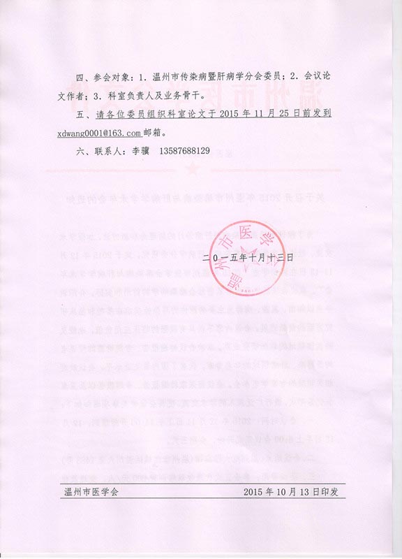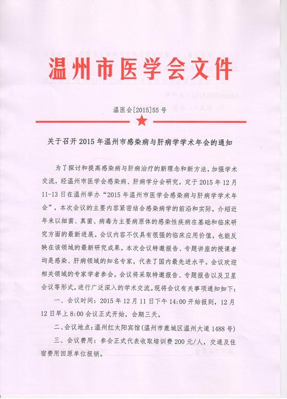 关于召开2015年温州市感染病与肝病学学术年会的通知