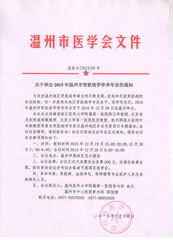 关于举办2015年温州市肾脏病学学术年会的通知