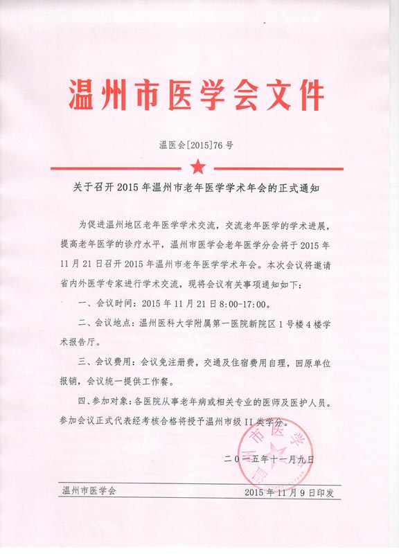 关于召开2015年温州市老年医学学术年会的正式通知