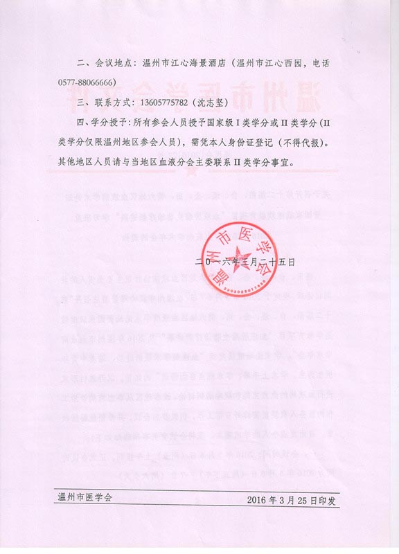 关于召开第十二届甬、台、温、金、丽、衢六地区血液病学术论坛暨国家级继续教育项目“血液肿瘤生物治疗新进展”学习班及2016年温州市血液病学术年会的通知