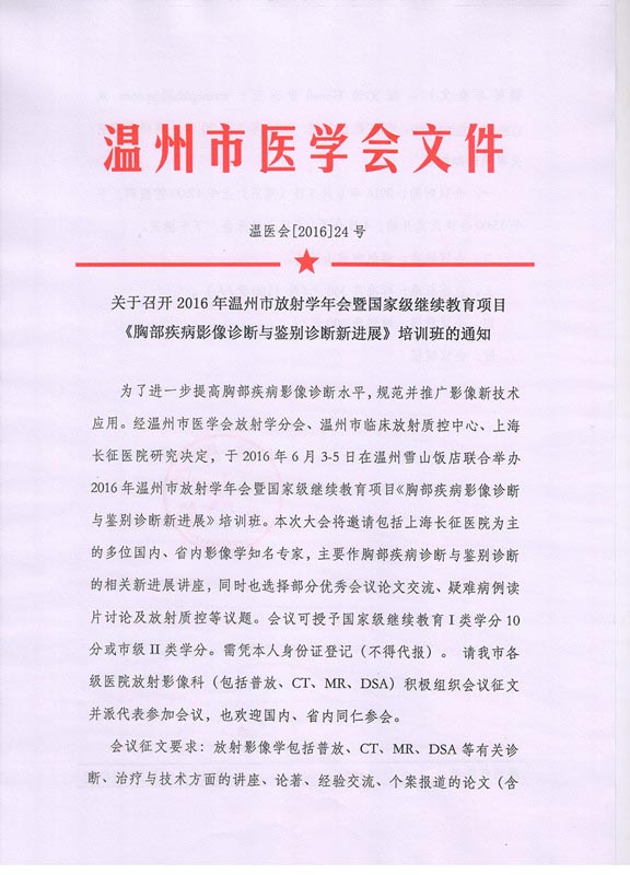 关于召开2016年温州市放射学年会暨国家级继续教育项目《胸部疾病影像诊断与鉴别诊断新进展》培训班的通知