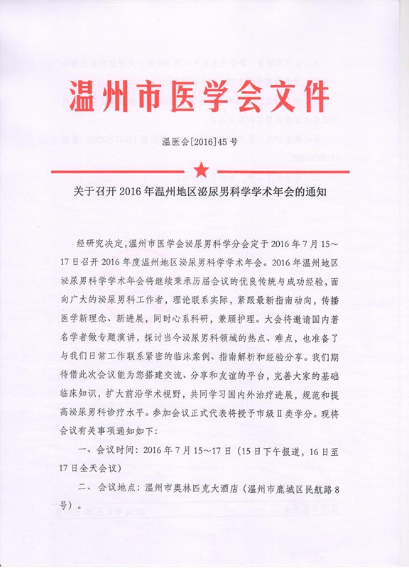 关于召开2016年温州地区泌尿男科学学术年会的通知