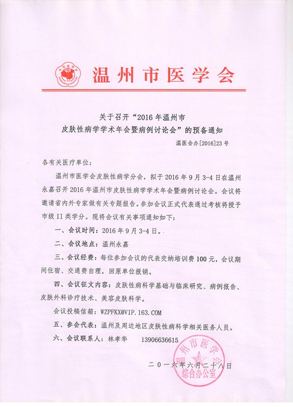 关于召开“2016年温州市皮肤性病学学术年会暨病例讨论会”的预备通知