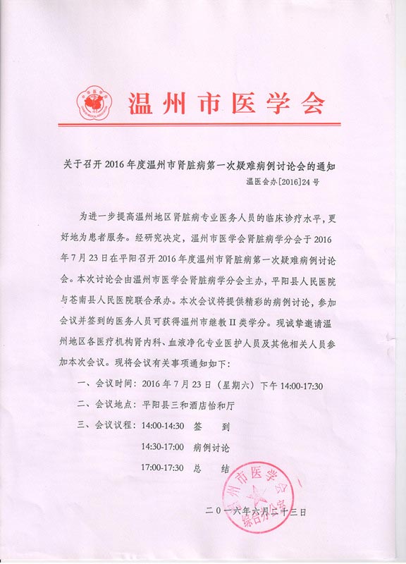 关于召开2016年度温州市肾脏病第一次疑难病例讨论会的通知