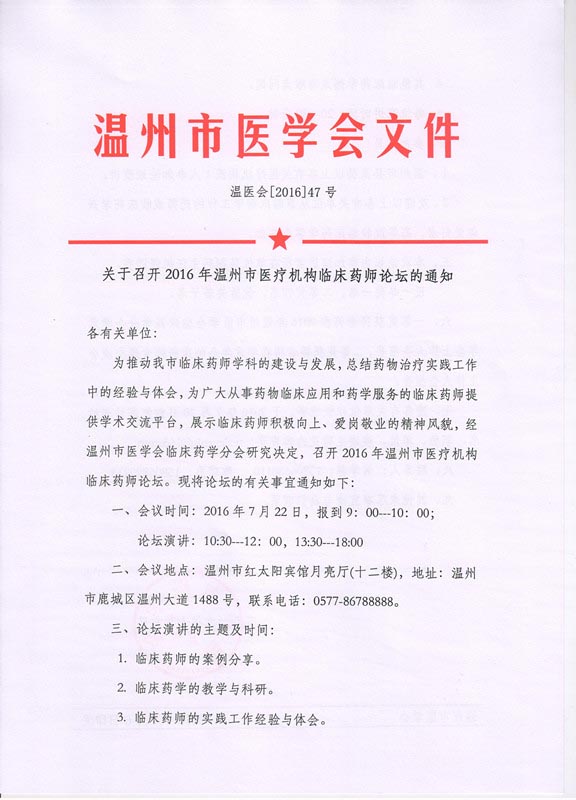 关于召开2016年温州市医疗机构临床药师论坛的通知