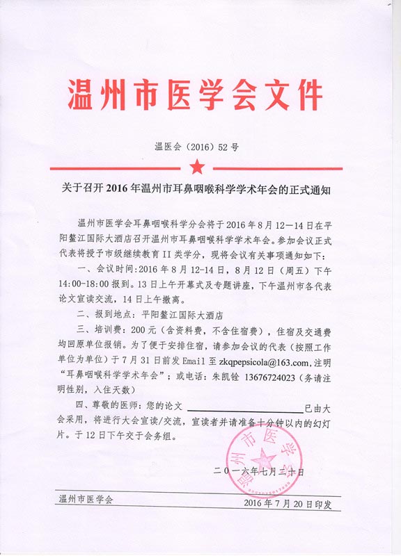 关于召开2016年温州市耳鼻咽喉科学学术年会的正式通知