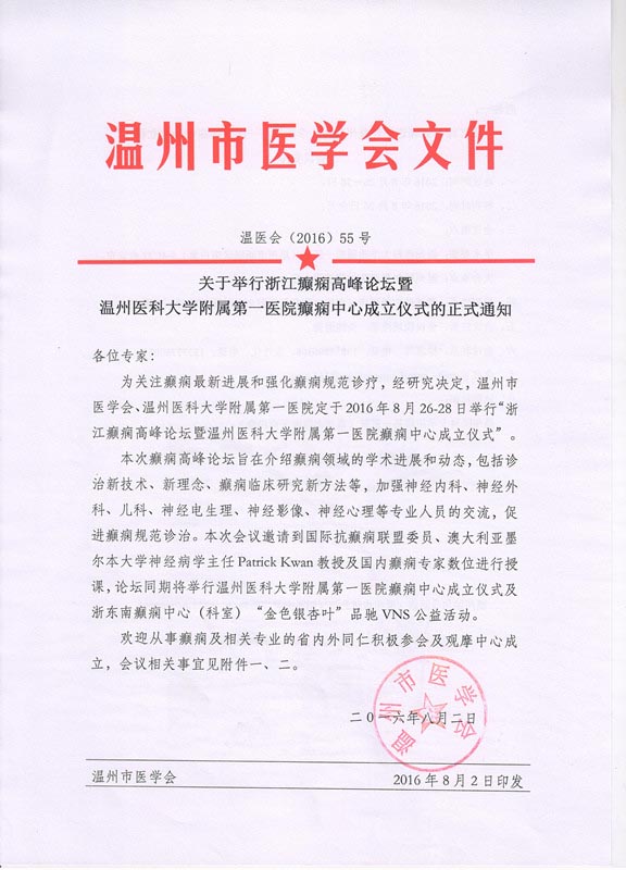 关于举行浙江癫痫高峰论坛暨温州医科大学附属第一医院癫痫中心成立仪式的正式通知