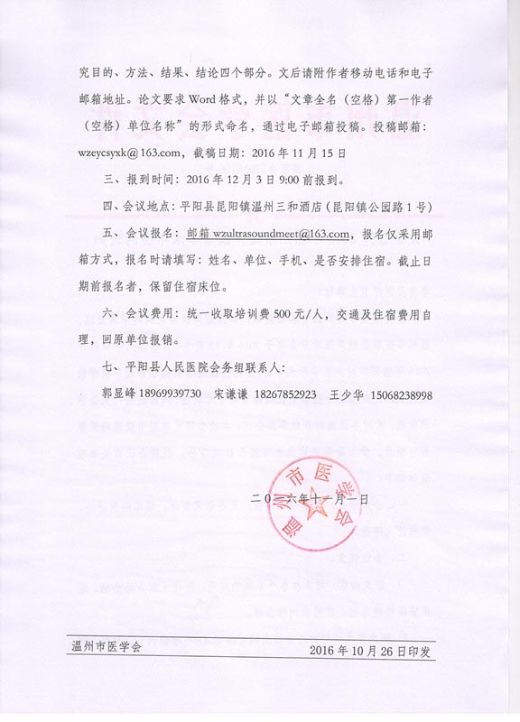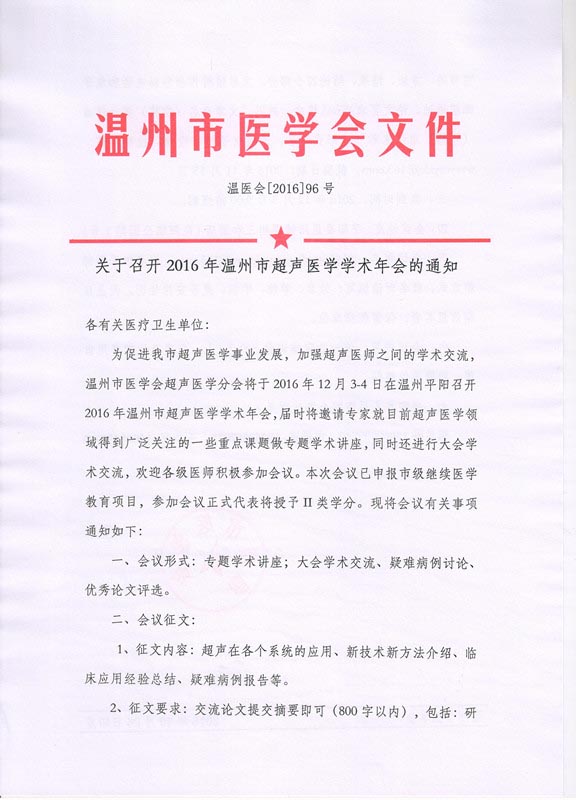 关于召开2016年温州市超声医学学术年会的通知