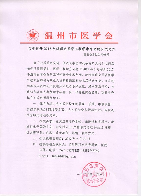 关于召开2017年温州市医学工程学术年会的征文通知